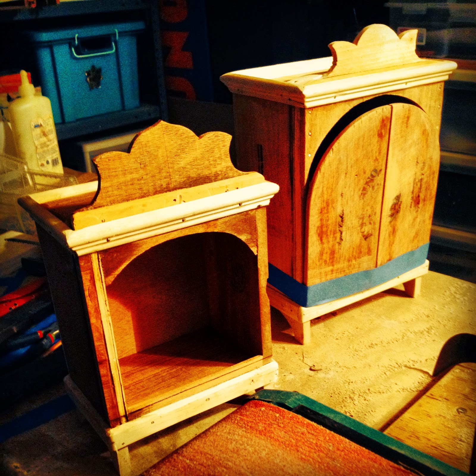 cigar boxes converted to "furniture"; hinged doors